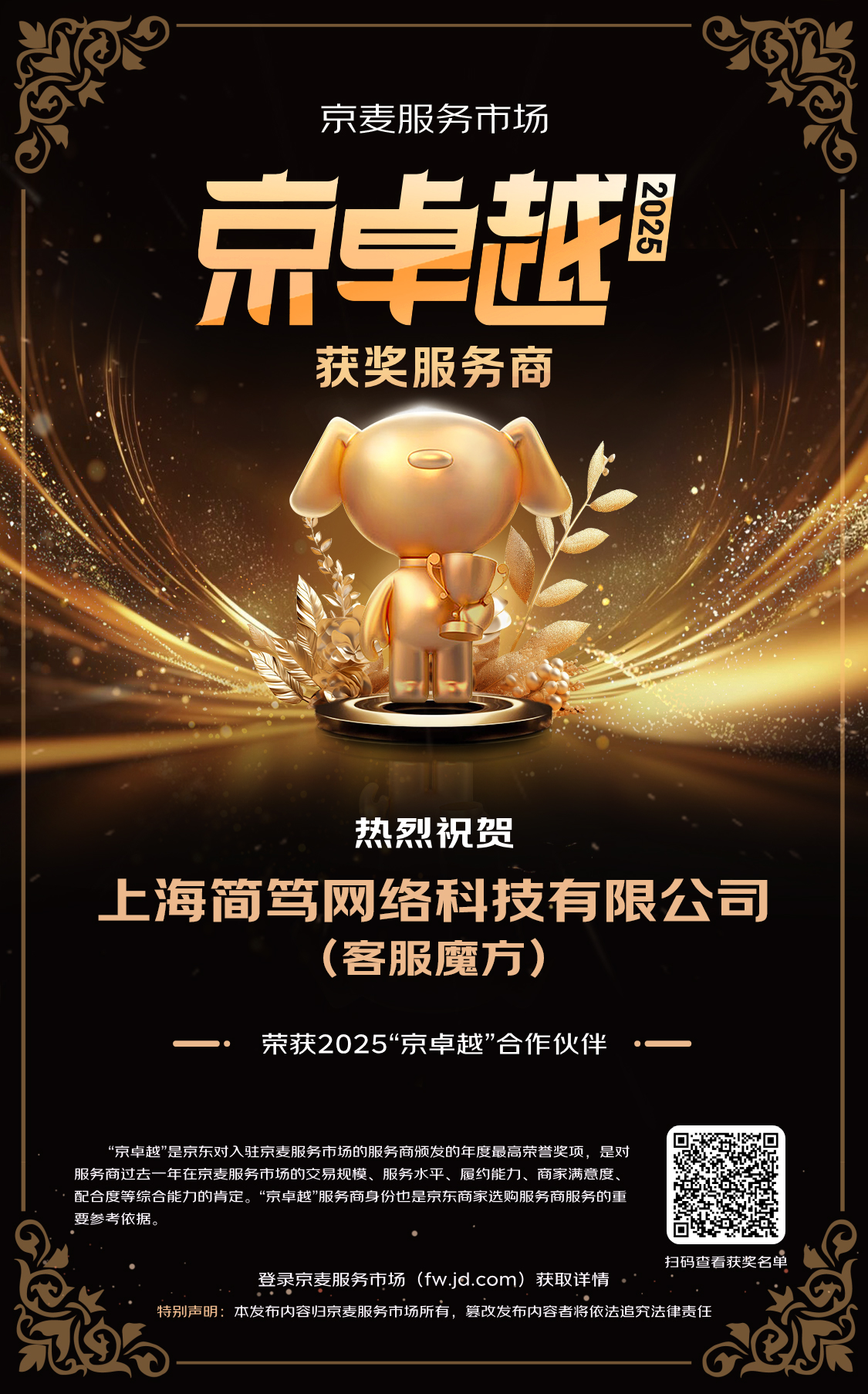 昨日,京東正式發布了年度京東服務市場“京卓越”服務商獲獎名單。上海簡篤網絡科技有限公司(簡稱“簡篤科技”),憑借卓越的智能軟件服務能力從眾企業中脫穎而出,第三次榮獲京東服務市場客服工具“京卓越”合作伙伴獎。
